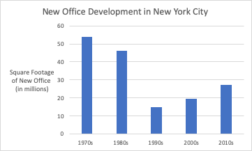 Looking forward, the report anticipated that New York City would add nearly 600,000 jobs over the next 20 years, half of which would be office-based. The city would need 23 million square feet of new office space over the next 20 years and an additional 60 million square feet thereafter through 2050. Looking at the development trends of the previous decade, construction had all but stalled for new office space. The city’s development market was paralyzed.