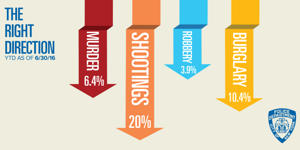 “You’re going to hear some numbers that are striking,” said Mayor Bill de Blasio as he began an August 4 press conference on the city’s latest crime statistics. “2016 saw the fewest shootings, the fewest robberies, the fewest burglaries, the fewest auto-thefts of any first-half of a year in a CompStat era. So, when you think about that, the lives of everyday New Yorkers are freer. They’re more peaceful. They’re less disrupted. And people have every reason to feel safer.”