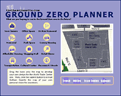 We are no longer accepting entries through the Ground Zero Planner, but you can still play the game and try it out. The Ground Zero Planner allows you to design the World Trade Center site the way you think it should look. You can drag icons representing different ideas for the site, like housing, parks, and a memorial, onto a map of Ground Zero.