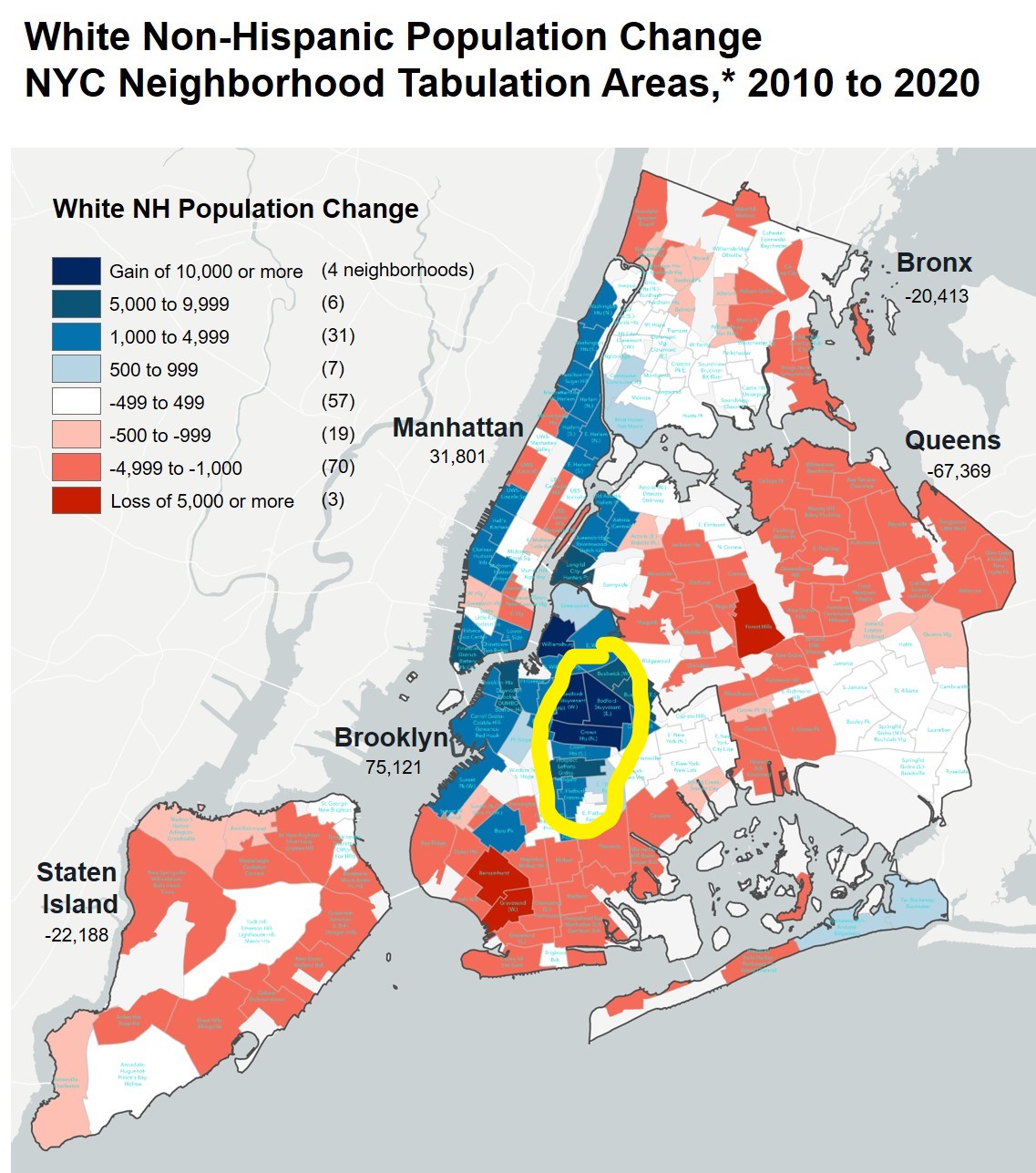 Perhaps the current ground zero for the conflict between an expanding white demographic and a shrinking Black demographic encompasses the communities in and around Bedford-Stuyvesant, Crown Heights, Bushwick, and into East New York (roughly highlighted in the yellow ovals on Figures 3 and 4 below) where there has been a particularly striking racial turnover.