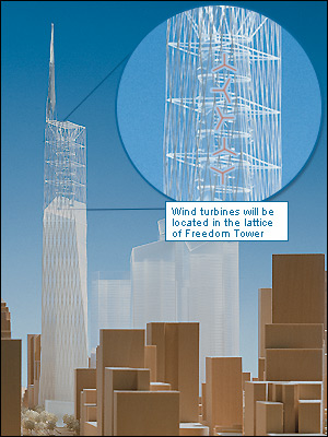 ![]() The latest design of the Freedom Tower at Ground Zero includes power-generating wind turbines in the upper section - or "lattice" - of the building. |