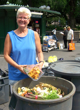 Aurelia Kaelin was collecting compost for the Lower East Side Ecology Center at Union Square on a Wednesday morning. "Oh, they show up," she said of Manhattan composters, explaining that she has regulars from all over the island. Most people who collect food waste regularly in their apartments come bearing compost about twice a week, although she added, "We always have a lot more the few weeks after Earth Day."