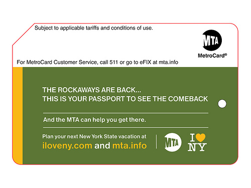 Cuomo unveiled the "Come See the Comeback" campaign to boost tourism in the areas hardest hit by Sandy. There are newly designed MetroCards highlighting Staten Island, the Rockaways, Howard Beach, Coney Island and Long Beach. The Rockaways card is featured above.