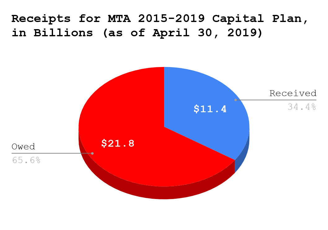 As of May 2019, the MTA has gotten only $1 billion of the state bailout money promised in 2016, and $11 billion from all sources for the $33 billion it planned to spend on the 2015-2019 capital plan.