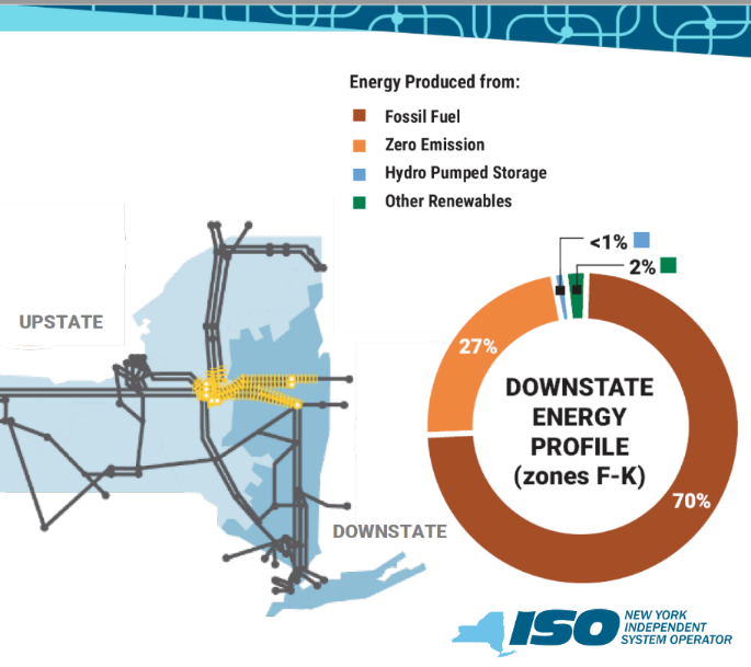 First, the latest figures (2018) show that fossil-fuel plants supply downstate New York (New York City, Long Island, and the Hudson Valley) with 70 percent of its electricity, as per the donut chart below from the NY Independent System Operator, the state-chartered body that manages New York’s power grid. Moreover, because their fuel costs make them costlier to run, these plants, which are almost entirely fueled by natural gas, are always called on after the state’s renewable and nuclear sources. This guarantees that the “marginal” (last) units topping off the grid — the ones that will be fired up in place of Indian Point — are almost always gas-fired plants rather than zero-carbon generators.