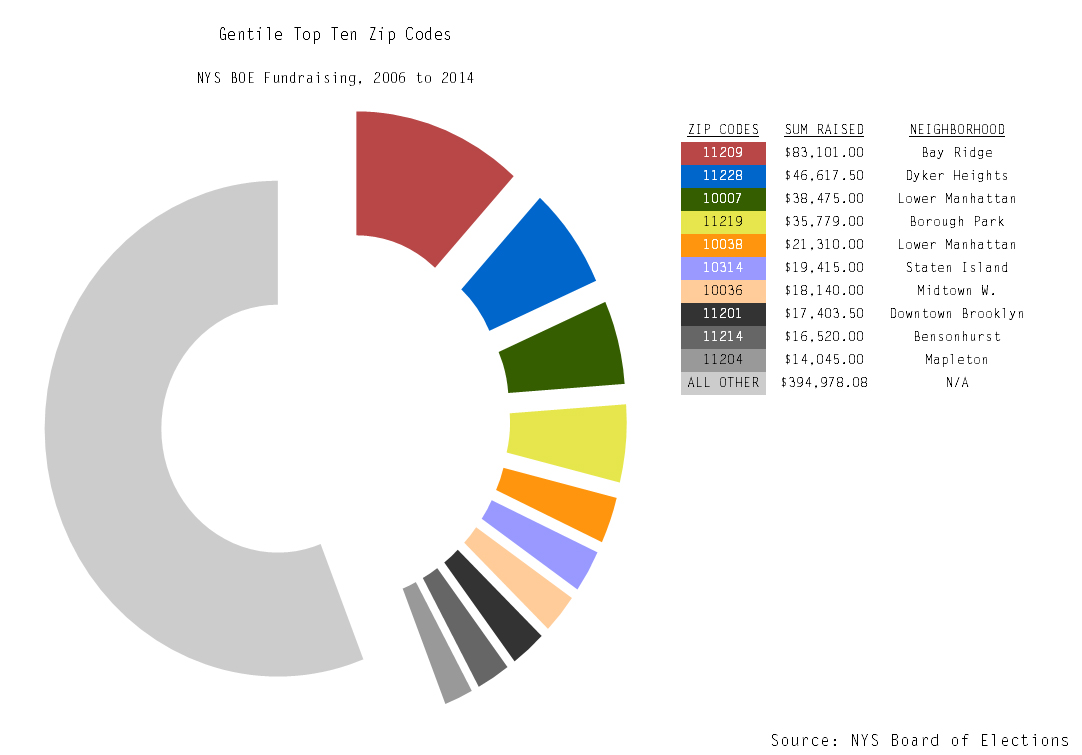 While seven of Donovan's top ten ZIPs are actually in Manhattan and three are on Staten Island, six of Gentile's top ten are in Brooklyn. Five are local to his council district while one is in Downtown Brooklyn. Three of Gentile's top ten ZIPs are in Manhattan and one is on Staten Island.